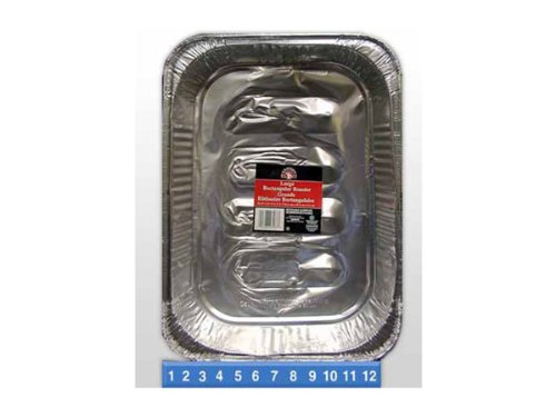 This rectangular roaster is perfect for roasting meats and poultry. Can also be used to hold pastas or pastries. Item is made from high quality aluminum and comes loose for easy shelf display. Measures approximately 16 1/2" x 12 1/2" and almost 3" deep